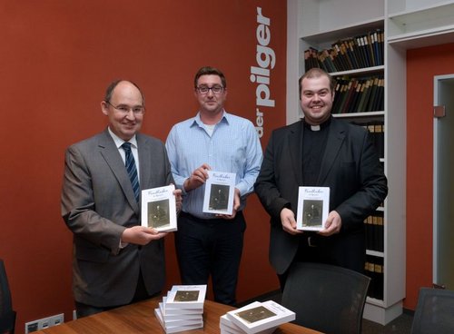Dr. Thomas Fandel, Leiter des Bistumsarchivs, Thorsten Wolff vom Pilger-Verlag und Herausgeber Dominik Schindler (v.l.n.r.) freuen sich über die neue Publikation.