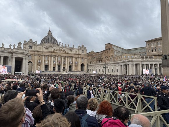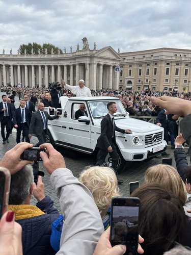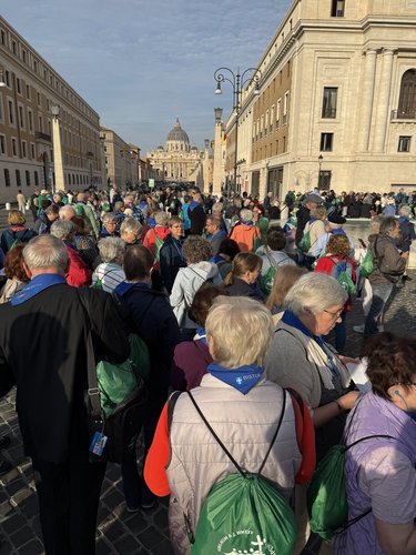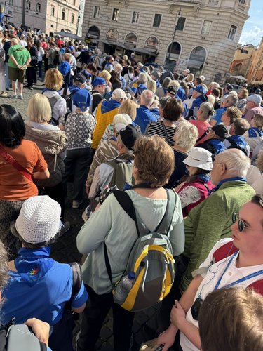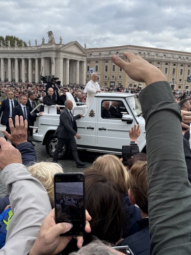 Ein wahrlich aufregender Tag liegt hinter uns oder mit anderen Worten: Dieser Tag war der Höhepunkt unserer Wallfahrt. Bereits um 6.45 Uhr ging es mit den Bussen von unseren Hotels aus los Richtung Petersplatz, denn heute stand die Generalaudienz mit Papst Leo XIV. auf dem Tagesprogramm. Neben den 357 Pilgerinnen und Pilgern aus Speyer wurden weitere 60.000 – 80.000 Gläubige erwartet. Eine unbeschreibliche Zahl, die in den vollen Straßen Roms spürbar war. Das Ziel war es natürlich: Papst Leo so nahe wie möglich zu kommen und eins oder auch zwei, oder vielleicht auch mehrere Fotos als Erinnerung mitnehmen zu können. Als wir auf dem Petersplatz ankamen, hieß es erstmal durchatmen: Die erste Hürde war geschafft. Und mit Blick auf die Uhr war auch gar nicht mehr viel Zeit, um einen guten Stehplatz zu ergattern. Kurz vor 10.00 Uhr erblickten wir ihn dann, wie er mit seinem Papamobil durch die abgesperrten Wege bis zum Petersdom fuhr. Ein wirklich besonderer Moment! Aufregung macht sich in der Gruppe breit, es wurde gejubelt und gerufen!
