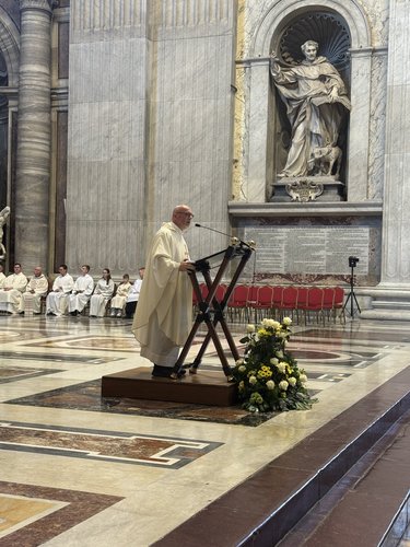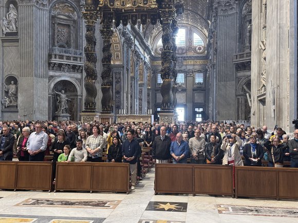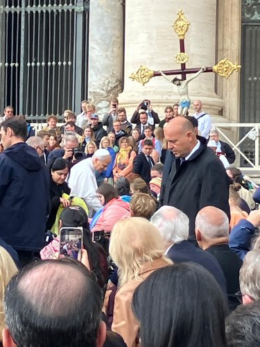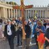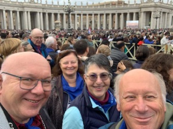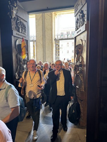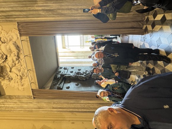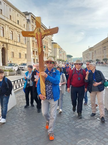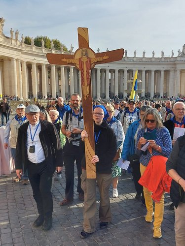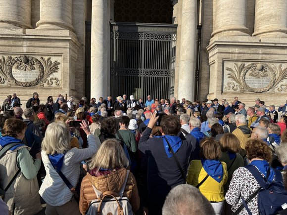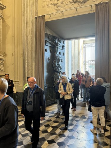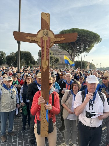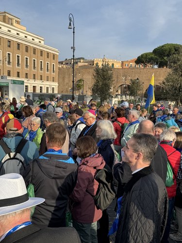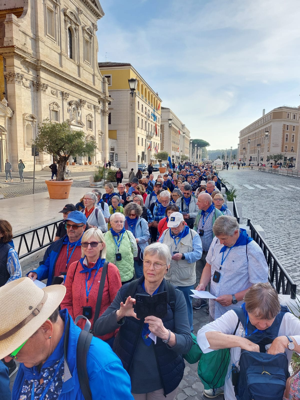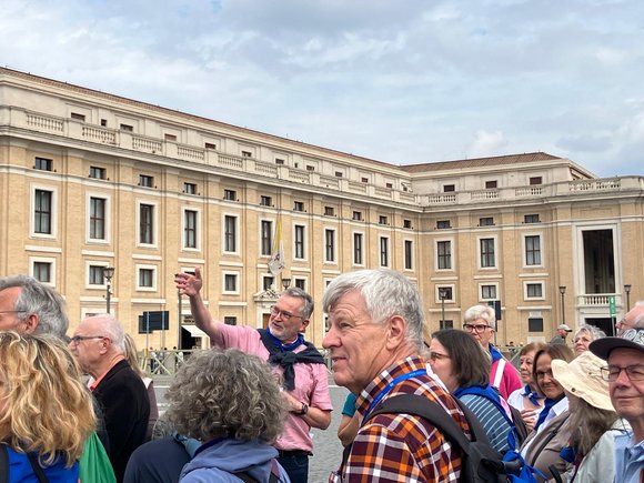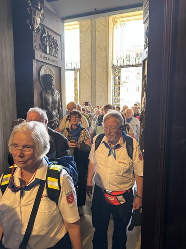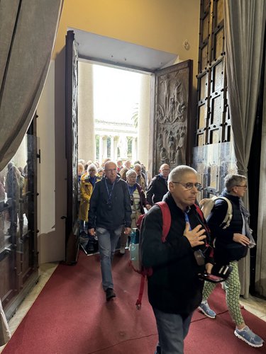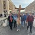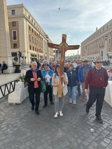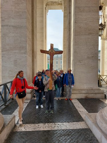 Der Morgen des zweiten Tages startete mit einem beeindruckenden und bewegenden Pilgerweg von der Engelsburg über die Via de la Conciliazione, über den Petersplatz in die Peterskirche. Gemeinsam beteten wir, verbunden über die Kopfhörer, vorne weg abwechselnd Pilgerinnen und Pilger, die ein Holzkreuz trugen und die Gruppe leiteten. Das Tragen des Kreuzes löste tiefe Berührung aus. Der Weg führte vom Obelisken auf dem Petersplatz hinein in den Petersdom durch die Heilige Pforte. Angekommen im Petersdom feierte die Reisegruppe einen Gottesdienst. Ein erhabenes Gefühl machte sich breit, in diesem denkwürdigen Dom, gemeinsam eine Messe zu feiern.