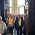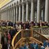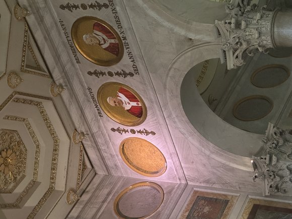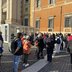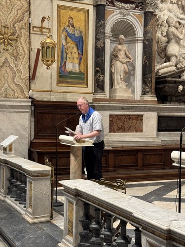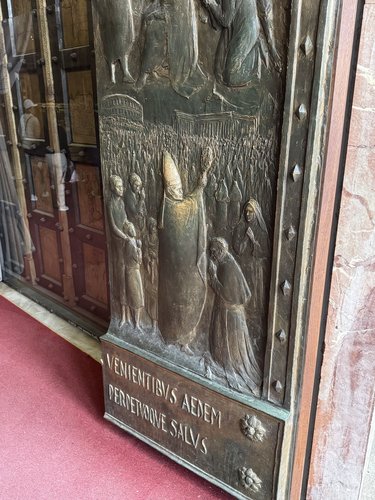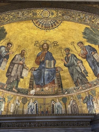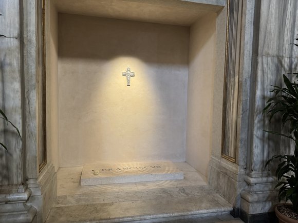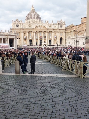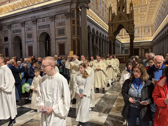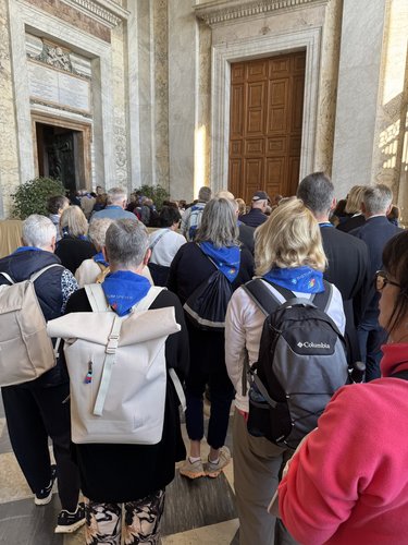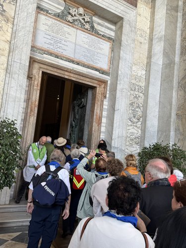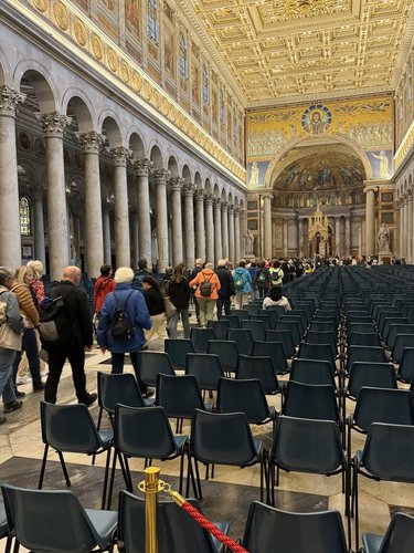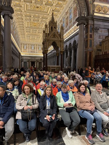 Nach so vielen Eindrücken, kommt die Mittagspause gerade recht, die, wir sind in Rom, wie soll es also anders sein, mit Pizza essen verbracht wurde. Im Anschluss geht es weiter, zur Basilika Santa Maria Maggiore. Bei der Ankunft wird klar, was zu dieser Wallfahrt auch gehört ist, das Anstehen und Abwarten. Doch das trübt die Stimmung in der Gruppe nicht. Beim Warten wird geplaudert und gebetet, sich ausgetauscht oder sinniert. In der Zwischenzeit gesellte sich auch Bischof Wiesemann zur Gruppe, der via Kopfhörer der Pilgergruppe beim Durchschreiten der Heiligen Pforte on Santa Maria Maggiore einige besinnliche Gedanken mitgab. Wer die Kirche erkunden wollte, konnte dies gemeinsam mit einer Touristenführerin machen. Und dann hieß es nochmal anstehen, um einen besonderen Moment vor dem Grab von Papst Franziskus zu erhaschen und für ihn zu beten.