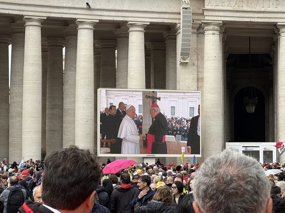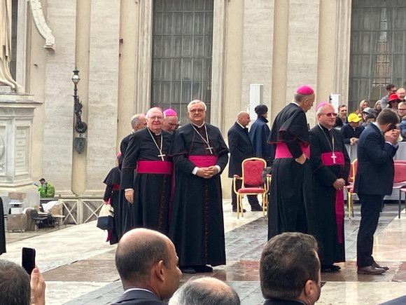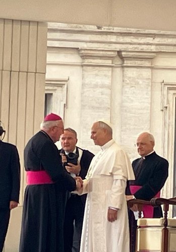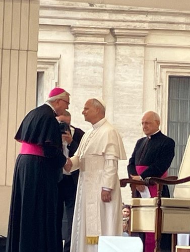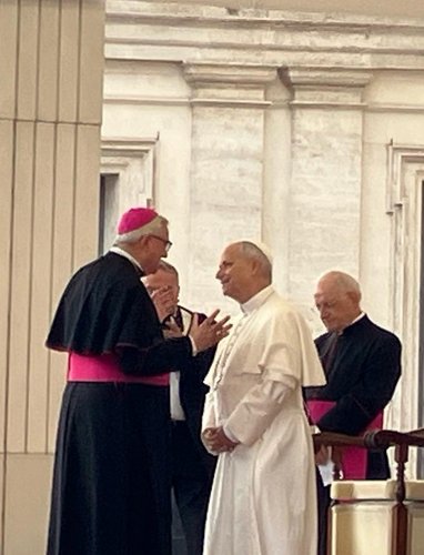 In der gleichen Zeit, nur wenige Meter vom Petersdom entfernt, erlebten Bischof Wiesemann und Weihbischof Georgens die Audienz noch näher, noch unmittelbarer. Und auch Generalvikar Magin und Kerstin Fleischer verfolgten die Ansprache des Papstes aus nächster Nähe. Nach der Audienz bekamen Bischof Wiesemann und Weihbischof Georgens auch die Gelegenheit bei einer Privataudienz Papst Leo die Hand zu geben und mit ihm ein paar Worte zu wechseln. Und dann das: Auch Kerstin Fleischer und Generalvikar Magin konnten sich spontan in die Schlange der Privataudienz anstellen, was sie natürlich direkt getan haben. Kerstin Fleischer berichtete danach: „Das war ein sehr bewegender Moment. Nachdem wir uns vorgestellt haben, haben wir Papst Leo berichtet, was unsere Diözese gerade bewegt und dass wir für ihn beten. Er hörte uns zu und antwortete dann: „God bless you.“ Diese Begegnung werde ich niemals vergessen!“