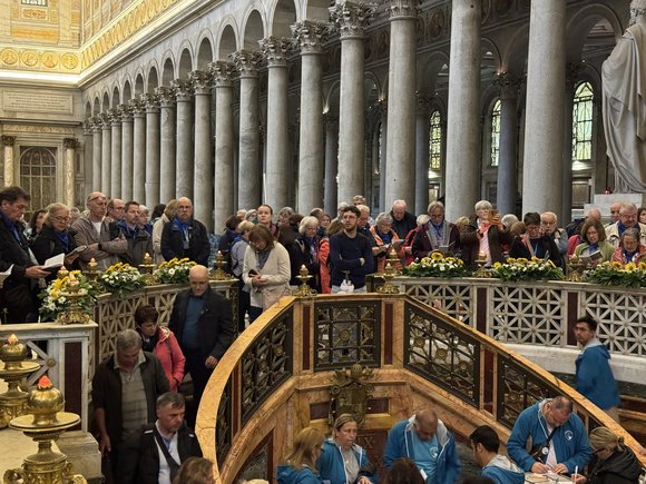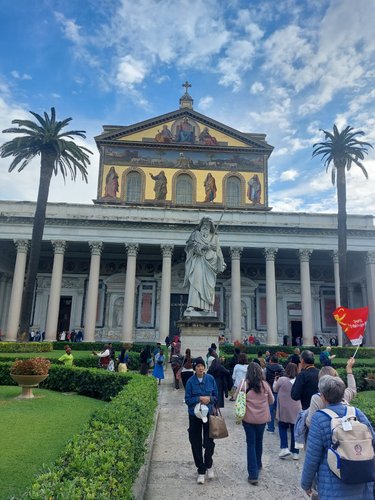 Gemeinsam unterwegs sein für die nächsten fünf Tage. Gemeinsam Glauben erleben und sich Gott näher fühlen. 357 Pilgerinnen und Pilger des Bistums Speyer haben sich auf den Weg gemacht. Und das ganz individuell – die einen zu Fuß, die anderen mit dem Bus, wieder andere mit dem Flieger. An diesem sonnigen Sonntagmorgen sind wir nun vor dem Lateran alle zusammengekommen und starten in die Wallfahrt im Heiligen Jahr 2025. Begleiten werden uns dabei immer wieder Hoffnungsklänge, das „Licht des Lebens“, die Hymne des Heiligen Jahres, mit dem wir uns mit allen Christinnen und Christen verbunden fühlen können. Eckpfeiler unserer Wallfahrt ist das Durchschreiten der Heiligen Pforten. Die erste, durch die wir in Stille laufen, ist die Porta Santa der Lateranbasilika. Anschließend findet sich Zeit, die beeindruckend verzierte Basilika zu erkunden.