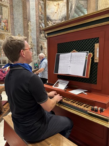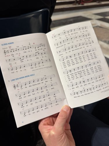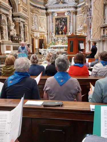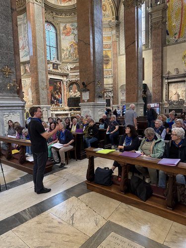 Am Nachmittag gab es für die Pilgerinnen und Pilger Gelegenheit, um in der deutschsprachigen Gemeinde S. Maria dell`Anima zu beichten oder an einer Probe des Wallfahrtschors teilzunehmen und mitzusingen. Der Wallfahrtschor, der von Diözesankirchenmusikdirektor Martin Erhard geleitet und gemeinsam mit Christoph Angeli dirigiert wurde, gestaltete musikalisch eine Andacht, die die Pilgerinnen und Pilger sehr bewegte. Kerstin Fleischer, Leiterin der Hauptabteilung Seelsorge und Organisatorin der Romwallfahrt und Regens Franz Vogelgesang, der ebenso Teil des Orga-Teams ist, trugen abwechselnd Gedanken zu den einzelnen Strophen des Liedes „Unser Suchen nach dem Einen“ aus dem Liedheft zur Romwallfahrt vor. Am Ende gab es langen Applaus für die tollen Gesangsbeiträge des Wallfahrtschors. Ein wahrlich stimmungsvoller Ausklang, gefüllt mit Hoffnungsklängen für den Abend und den morgigen Tag.