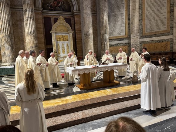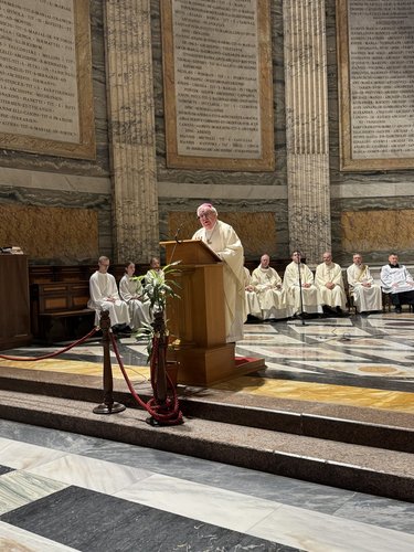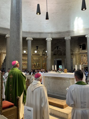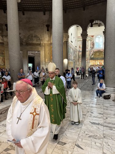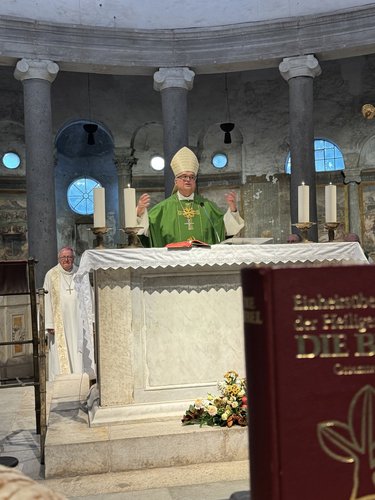 Ein gemeinsamer Eröffnungsgottesdienst in der Kirche Santo Stefano Rotondo, die bereits seit der Antiken existiert und mit ihrer runden Anordnung und ihren in den Himmel ragenden Säulen ein erhabenes Gefühl auslöst, gaben dem ersten Wallfahrtstag einen feierlichen Rahmen. Bischof Wiesemann, Weihbischof Georgens, Generalvikar Magin und zahlreiche Priester und Diakone der Diözese feierten mit der Pilgergruppe die Gemeinschaft. Bischof Wiesemann begrüßte, die Pilgerinnen und Pilger, darunter auch jene, die zu Fuß nach Rom gekommen sind, die Teil der Staffelpilger-Gruppe waren, die sich bereits im Juli auf den Weg in die ewige Stadt gemacht haben. Bischof Wiesemann: „Wir können hier gemeinsam in Rom, in diesen heiligen Stätten, unserem Glauben neu Kraft und Lebendigkeit geben in der großen Weltgemeinschaft der Kirche, die hier in Rom so unmittelbar erfahrbar wird.“ Alle Pilgerinnen und Pilger konnten zu Beginn des Gottesdienstes ihr Taufversprechen erneuern und als „Kinder Gottes“ vor Gott ein Zeugnis ablegen. Der Wallfahrtschor, der sich für diese Reise gegründet hat, gestaltete den Gottesdienst musikalisch und zeigte wie sehr die Musik die Herzen berührte.