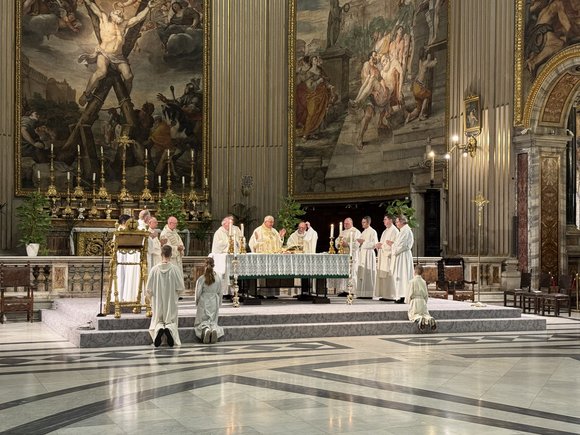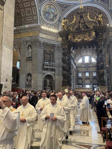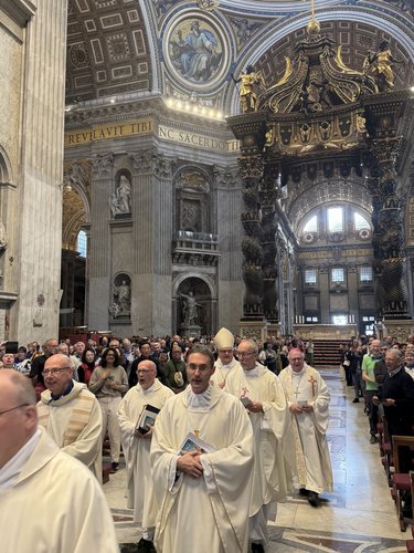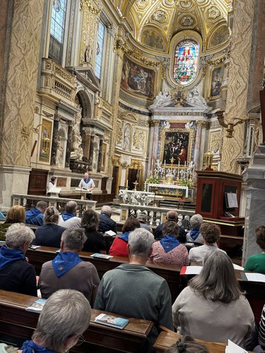 In der Kirche S. Andrea della Valle feierten wir dann zum Abschluss einen feierlichen Gottesdienst. Musikalisch erneut gestaltet von unserem Wallfahrtschor, mit Liedern, die uns die gesamte Reise bereits begleiteten. Bischof Wiesemann resümierte in seiner Predigt: „Wie reich beschenkt wurden wir mit diesen Tagen, tiefgehende Erfahrungen, die uns wieder neue Hoffnungskraft des Glaubens gegeben haben und uns zu Pilgerinnen und Pilger der Hoffnung machen. Wie die Kirche lebt, wie der Glaube lebt, das durften wir in diesen Tagen in Rom, als Ort der Kirche der ganzen Welt, erleben.“