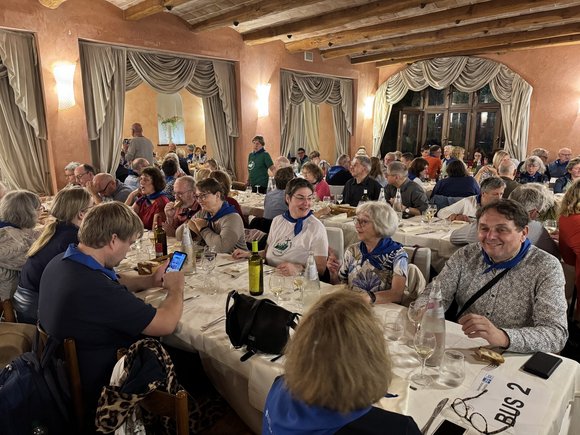 Nach dem Gottesdienst gab es ein gemeinsames Abendessen aller Pilgerinnen und Pilger. Eine schöne Gelegenheit auf die letzten Tage zu blicken und die Ereignisse Revue passieren zu lassen. Natürlich mit lecker Pasta und dem ein oder anderen Gläschen Wein.