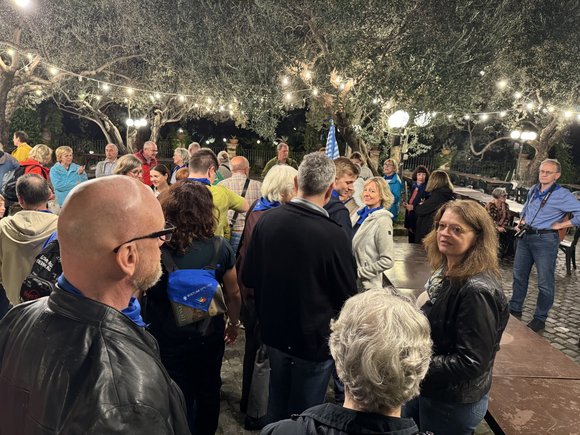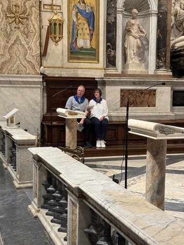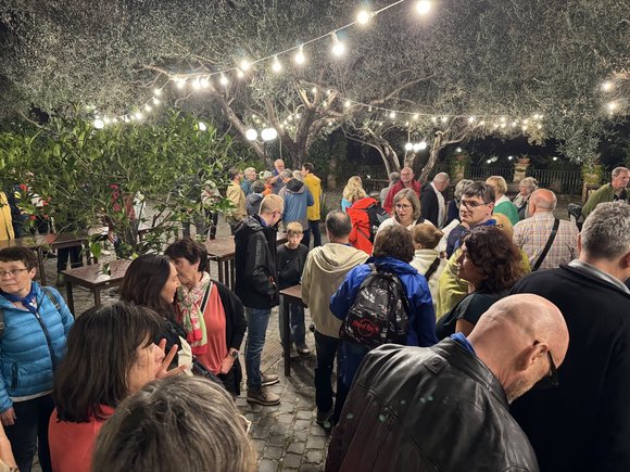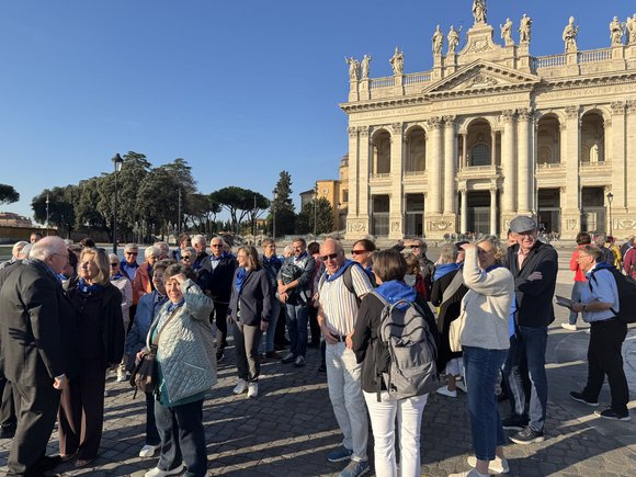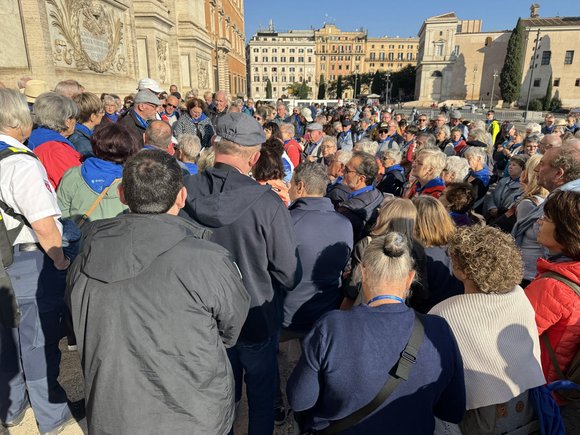 Am Nachmittag konnten die Pilgerinnen und Pilger unterschiedliche Programme wählen: Darunter Führungen durch Rom für Einsteiger mit Dekan Dominik Geiger, eine historische Erkundungstour durch Rom mit Generalvikar Markus Magin oder auch eine Tour durch das Stadtviertel „Centro Storico“ mit Kanzleidirektor Wolfgang Jochim. Mit Regens Franz Vogelgesang ging es auf einem Spaziergang „Abseits der Pfade“ und Diakon Michael Ganster bot an, die Trastevere zu entdecken. Erhard Steiger besuchte mit einer Gruppe das Benediktinerkloster St. Anselmo, Dekan Johannes Pioth bot eine Tour unter dem Titel „Römisches Jerusalem“ an und mit Pfarrer Udo Stenz ging es hoch hinaus: Gemeinsam mit ihm konnten die Pilgerinnen und Pilger Blicke über Rom erhaschen. Ein spirituelles Angebot boten Monika Kreiner und Dr. Margit Maar-Stumm und Peter Hundertmark an, wobei die Pilgernden geistliche Impulse mit den dreien aufschlüsselten und dann gemeinsam in Dialog traten und über die Texte ins Gespräch kamen. Für alle Singbegeisterte gab es auch einen eigenen Programmpunkt: Martin Erhard, Diözesankirchenmusikdirektor lud alle Interessierten ein in San Lorenzo, einer der ältesten Kirchen Roms einmal quer durch das Wallfahrtsliederheft zu singen.