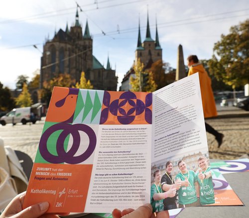 Andreas Kratel, Leiter der Abteilung Katholikentage und Großveranstaltungen beim ZdK, stellte das Programm im Detail vor. Der 'Rote Faden Demokratie und Vielfalt' kennzeichnet darin Veranstaltungen mit Demokratie-Schwerpunkt – eines der Profilthemen des Katholikentags. Insgesamt sind rund 500 Veranstaltungen im Programm, davon über 80 mit einem ausgewiesenen Bezug zu Thüringen, zur Geschichte der deutsch-deutschen Einigung und zu den Erfahrungen von Christ:innen in der DDR und während der Friedlichen Revolution. Vierzig Podien ermöglichen 'Debatten im großen Raum', wie Kratel sagte. 'Thematisch ist dort eine breite Palette zu finden, vom interreligiösen Dialog über Klimagerechtigkeit bis zu Frieden und Versöhnung'. Aus aktuellem Anlass kurzfristig ins Programm aufgenommen wurden Podien zur Krise und dem Konflikt in Israel und Gaza sowie zum Thema 'Demokratischer Frieden in Zeiten des Populismus'. Ein Europatag am Samstag soll den Gedanken des europäischen Miteinanders in den Mittelpunkt rücken – im Jahr der Europawahl, die direkt auf den Katholikentag folgt. Insgesamt habe man sich mit der Konzentration auf 500 Veranstaltungen ganz bewusst fokussiert. 'Der Katholikentag verändert sich, dazu gehört auch diese Entwicklung', sagte Kratel.
