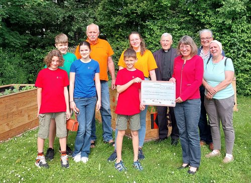 Die Kinder und Jugendlichen, die zur Spendenübergabe mitgekommen waren, machten noch einen Abstecher zum Weltgarten und den Hochbeeten – denn auch hier hatte sich die Kolpingsjugend der Pfingstweide während der Aktion 72 des BDKJ ein weiteres Mal für den guten Zweck engagiert und dieses Projekt während dreier kalter und nasser Tage im April im Park des HPH realisiert.