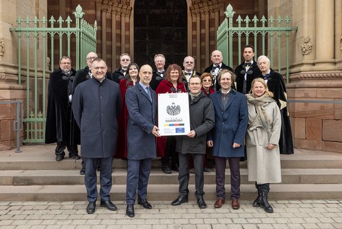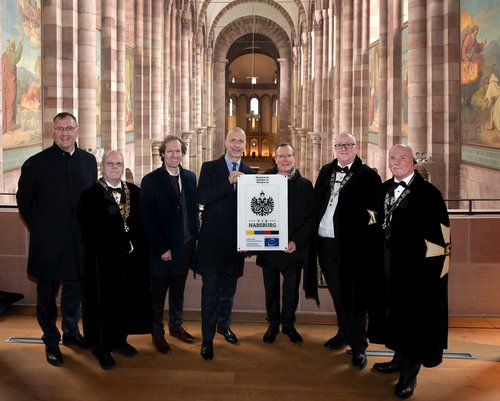 Der Prokurator des St. Georg-Orden Baron Vincenz Stimpfl-Abele übergibt symbolisch das Schild der Via Habsburg an Domdekan Dr. Christoph Kohl. Ebenfalls auf dem Bild sind Vertreter des St. Georg-Orden und der Direktor des Historischen Museums der Pfalz Prof. Dr. Alexander Schubert © Bistum Speyer