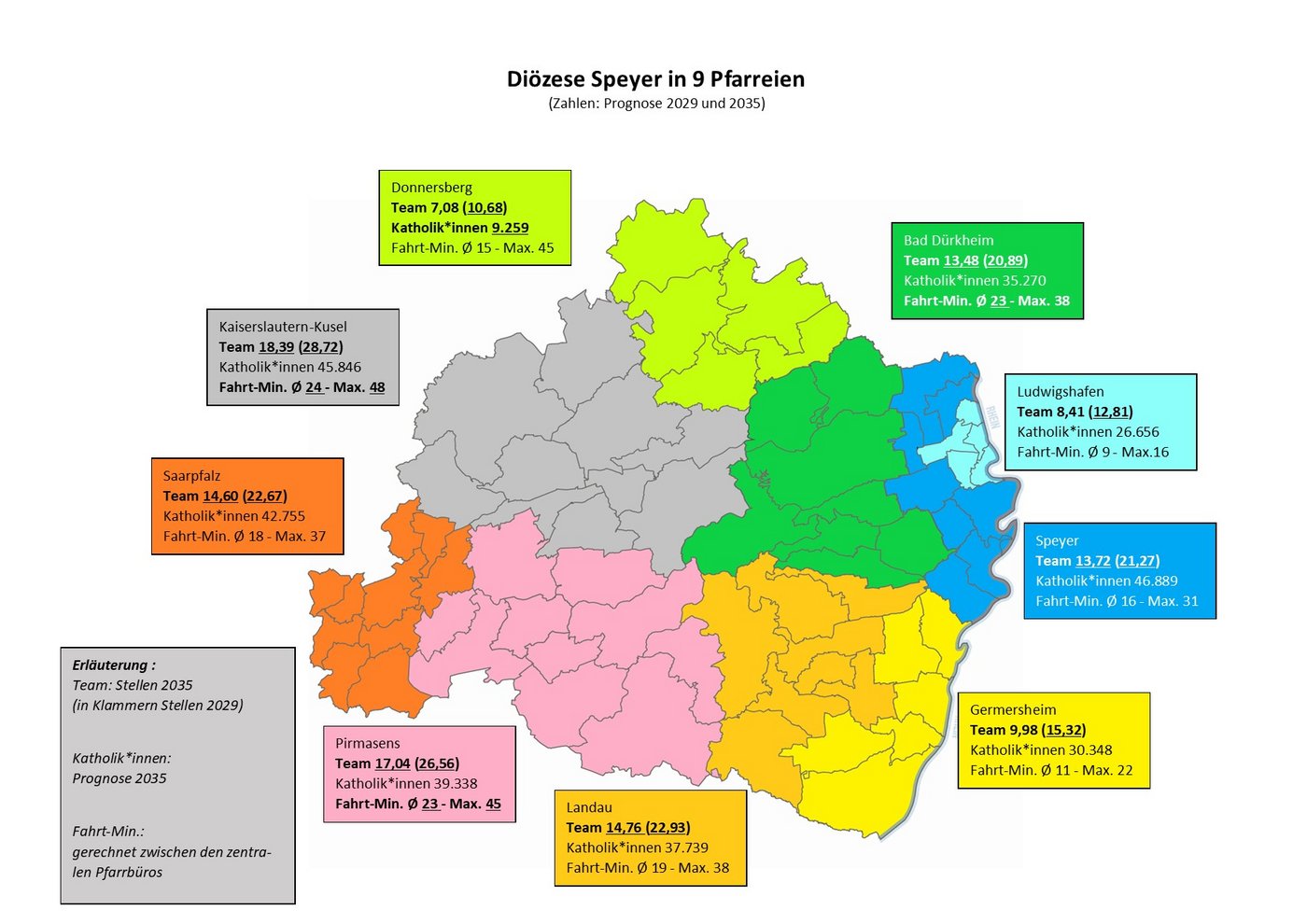 Finanzielle und personelle Gründe, aber auch eine rückläufige Zahl der Gläubigen, führen dazu, dass die bisherigen 70 Pfarreien in absehbarer Zukunft nicht mehr als territoriale Struktureinheiten des Bistums ausreichen werden. Im Unterschied zum ersten Entwurf sollen die vorgesehenen elf Dekanate nun als Pfarreien begründet werden. Geplant sind neun Pfarreien, die sich an den Grenzen der bisherigen zehn Dekanate orientieren sollen – die Dekanate Kusel und Kaiserslautern sollen zu einer Pfarrei zusammengefasst werden.