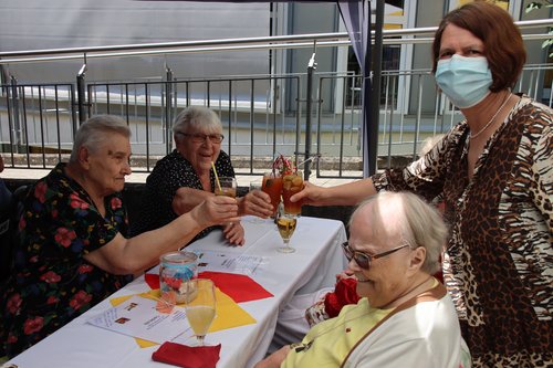 Am Nachbartisch sitzen die Bewohner Hans Schwind und Renate Trippen ins Gespräch vertieft. Die beiden sind oft im Garten aber auch in der Stadt unterwegs, erzählen sie. Das Fest sei schon etwas Besonderes, stellen sie fest. Und ein Viertel guten Weißwein zum Mittagessen sei auch nicht zu verachten, findet Hans Schwind. Die beiden sitzen noch eine Weile zusammen, während sich die Tische langsam leeren. Feiern macht müde und ein Mittagsschläfchen können einige der Bewohner jetzt gut brauchen.