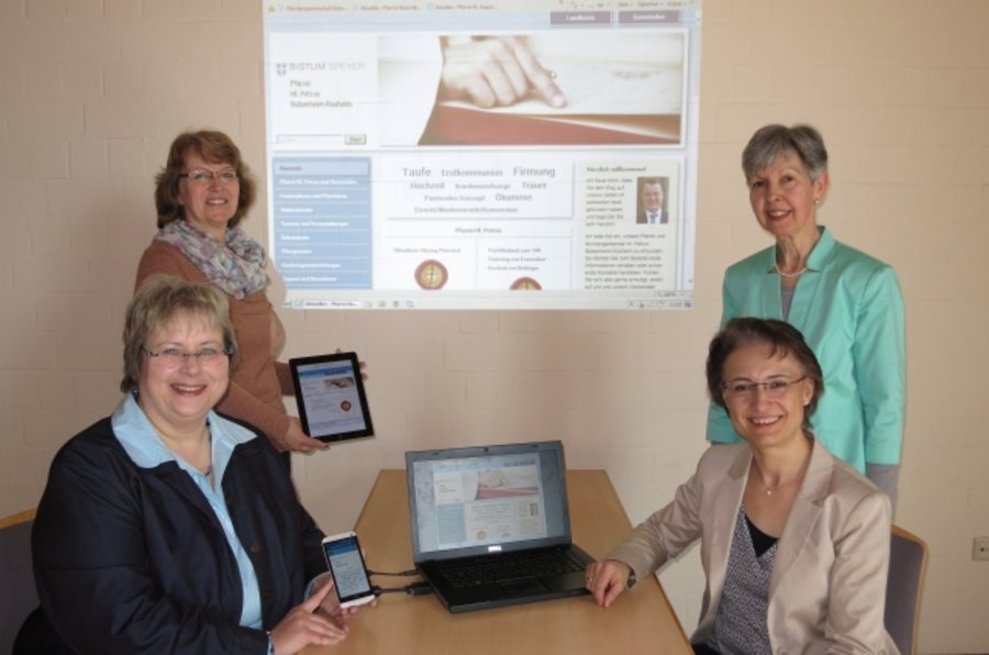 Gelungene „Webpremiere“: Das Redaktionsteam der Pfarrei „Heiliger Petrus Bobenheim-Roxheim“ (im Bild von links: Annette Hesch, Martina Ulrich, Eva Bodensohn Gemeindereferentin Barbara Sedlmeier, stehend) bei der Freischaltung des neuen Internetauftritts.