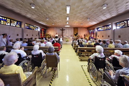 Die Kirchenbänke reichten bei weitem nicht aus, um alle Gottesdienstbesucher aufzunehmen, obwohl man, was an zusätzlichen Stühlen Platz bieten konnte, herbeigeschafft hatte. Viele feierten den Gottesdienst im Foyer des Altenzentrums stehend hinter den weit geöffneten Türen mit. Es waren nicht nur die Bewohner von St. Matthias, soweit es ihre Gesundheit zuließ, und die Mitarbeiter gekommen, sondern auch viele Gäste, Angehörige und Nachbarn, die in der Vergangenheit die Gottesdienste in der Kapelle mitgefeiert hatten. Es zelebrierte Domkapitular Karl-Ludwig Hundemer, Vorsitzender des Caritasverbandes der Diözese, zusammen mit Pfarrer Dr Georg Müller von der Pfarrei Edith Stein in Schifferstadt, sein Vorgänger, Dekan Peter Nirmaier, und Kooperator Pfarrer Albrecht Effler.