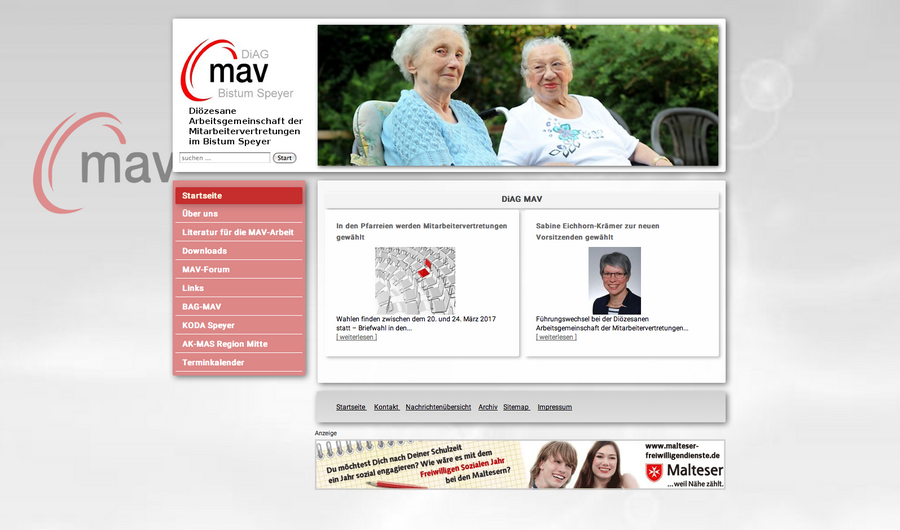 Speyer. Die Diözesane Arbeitsgemeinschaft der rund 135 Mitarbeitervertretungen kirchlicher Einrichtungen im Bistum Speyer (DIAG) hat eine neue Internetseite. Das Online-Informationsangebot ist jetzt unter www.diag-mav-speyer.de freigeschaltet worden. Die Seite ersetzt die bisherige in übersichtlicherer Weise, mit aktueller, sicherer und benutzerfreundlicher Software. Der Internetauftritt ist Teil der neu entstehenden Webseitenfamilie im Bistum, zu der zahlreiche neue Pfarreihomepages, aber auch die Auftritte kirchlicher Institutionen - vom Dombauverein bis zur Kirchenmusik - gehören. Die Konzeptentwicklung zur Erstellung der Webseiten verantwortet die Peregrinus GmbH in Speyer – in diesem Verlag erscheint die Kirchenzeitung „der pilger“.