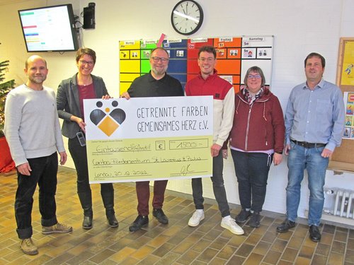 Landau. Auf 1500 Euro war der symbolische Scheck ausgestellt, den Oliver Hasert und Carsten Engel als Vertreter des Landauer Vereins „Getrennte Farben - gemeinsames Herz“ am Dienstag vor Weihnachten  in der Schule mit dem Förderschwerpunkt motorische Entwicklung am Caritas-Förderzentrum St. Laurentius und Paulus im Stadtteil Queichheim überreichten.