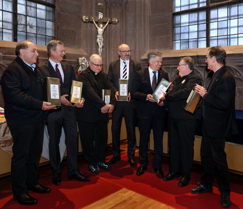 v.l.n.r.: Vertreter des Ordens der Ritter vom Heiligen Grab, Winfried Szkutnik, Dr. Benedikt Raether, Dr. Joachim Reger, Dr. Christian Pohl, Prof. Dr. Christopher Wolf, mit Domsakristan Markus Belz und Domdekan und Domkustos Dr. Christoph Kohl bei der Übergabe des Olivenöls in der Sakristei des Doms © Domkapitel Speyer, Klaus Landry