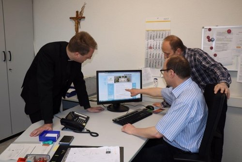 Pfarrer Dr. Georg Müller, Jürgen Reimer und Pastoralreferent Heinrich Schmith bei Betrachten des neuen Pfarreiauftrittes.