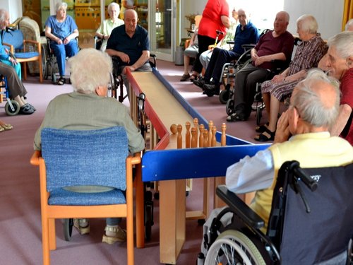 Bewohner nutzen begeistert neue barrierefreie Kegelbahn im Caritas-Altenzentrum Maria Rosenberg in Waldfischbach-Burgalben