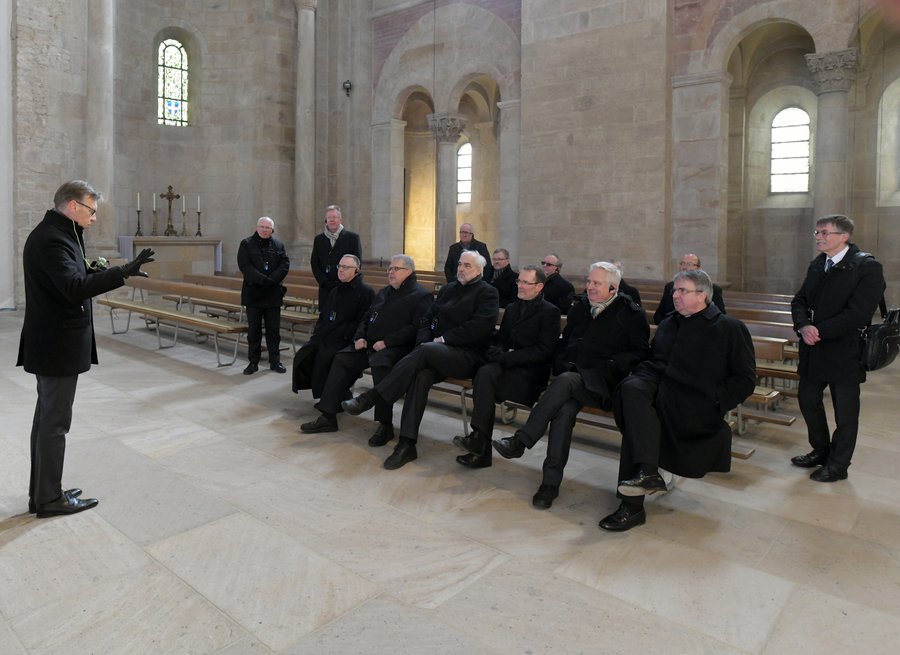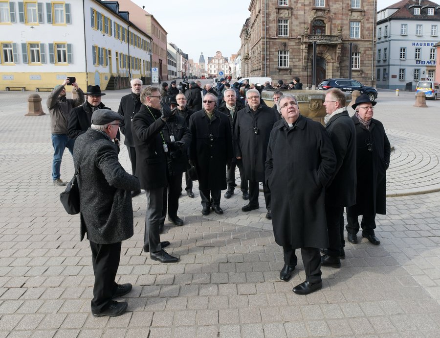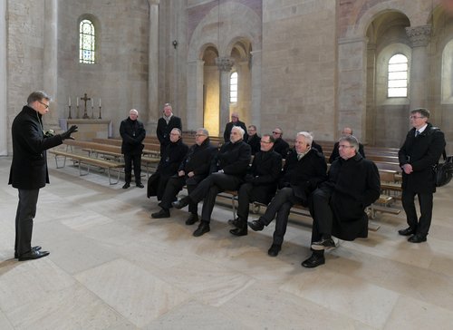 Speyer. Um seinen neuen Bischof kennenzulernen, ist das Würzburger Domkapitel heute nach Speyer gereist. Auf dem Domplatz wurden die Würzburger Domkapitulare unter Leitung von Weihbischof Ulrich Boom von Generalvikar Dr. Franz Jung, der am 16. Februar von Papst Franziskus zum neuen Bischof von Würzburg ernannt wurde, willkommen geheißen. Im Sitzungssaal des Bischöflichen Ordinariats fand ein erstes Treffen mit dem designierten Bischof und dem Speyerer Domkapitel statt. „Es war eine sehr herzliche Begegnung“, so Generalvikar Jung über das Gespräch. Domkustos Peter Schappert führte die beiden Domkapitel anschließend durch den Speyerer Dom.