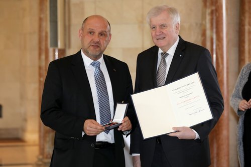 Speyer. Der Geschäftsführer der CSS Caritas Servicegesellschaft Speyer, Dr. Erich Rösch hat am 28. Februar von Horst Seehofer, damals noch bayerischer Ministerpräsident, das Verdienstkreuz an Bande der Bundesrepublik Deutschland verliehen bekommen. Mit dieser Auszeichnung, die vom Bundespräsidenten ausgesprochen wird, wurden Dr. Erich Röschs Verdienste um die Hospiz- und Palliativarbeit in Deutschland und im Ausland gewürdigt.