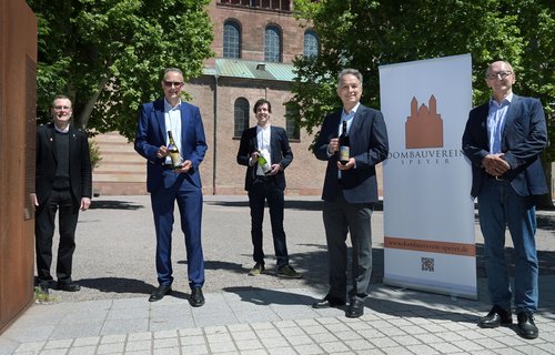 Speyer. Nicht wie seit vielen Jahren üblich in einer Feierstunde im historischen Ratssaal der Stadt Speyer im Beisein von Weinkönigin und Bürgermeisterin, sondern in kleinem Rahmen vor der Kulisse des Kaiser- und Mariendoms präsentierte der Dombauverein Speyer die Domwein-Edition 2020 und zugleich den Jubiläumssekt, der aus Anlass des 25jährigen Jubiläums des Vereins in diesem Jahr angeboten wird.