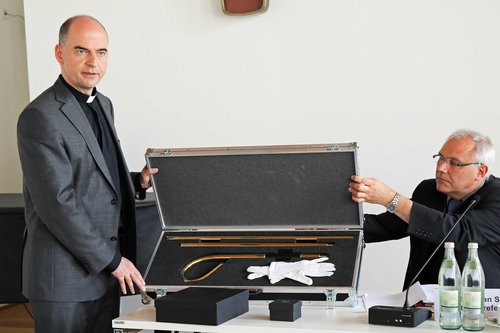 Ernannter Bischof Dr. Franz Jung stellt Wahlspruch und Wappen vor – Wappen mit Ankern und fränkischen Rechen – Bischofsstab als Dauerleihgabe aus dem Bistum Speyer