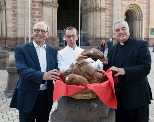 Präsentieren das neue „Dombrot“ vor dem Speyerer Dom: Dr. Gottfried Jung, Vorstandsvorsitzender des Dombauvereins, Peter Görtz, Geschäftsführer der Bäckerei Görtz und Bischof Dr. Karl-Heinz Wiesemann (v.l.n.r.)