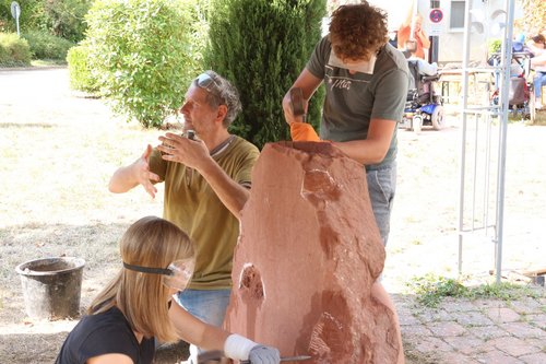Armin von Bibus, der als künstlerischer Restaurator in der Region tätig ist und regelmäßig Steinbildhauerkurse in der Kaiserbacher Mühle in Klingenmünster gibt, leitete alle Bildhauer-Anfänger mit viel Engagement und Geduld an. Während mehrerer Stunden hämmerten und meißelten immer mindestens zwei bis drei Kinder, Jugendliche und Erwachsene an dem Stein. Besonders engagiert bei der Steinmetzarbeit war der in Queichheim wohnende 14-jährige Robin. Gleich zu Beginn des Tages nahm er unter Anleitung des Bildhauers Hammer und Meißel in die Hand und arbeitete sich mit der Zeit immer geschickter durch den Stein. Die Werkzeuge legte er erst drei Stunden später aus der Hand, als ihn sein Vater mit seinen Geschwistern für einen Termin abholen musste.