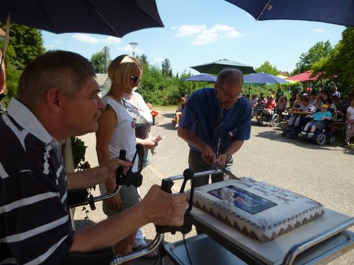 Moser dankte ihnen, wie auch all den nicht persönlich genannten Engagierten aus den Anfängen. Und natürlich den heutige Verantwortlichen der Geburtstagsstätten: Vera Eschmann, Leitung der Tagesförderstätte, Martina Werth, Leiterin des Wohnheims für Erwachsenen mit Mehrfachbehinderung sowie Jacqueline Konrad, Wohnbereichsleiterin. Werth, die schon drei Jahrzehnte hier ist und mit Blumen geehrt wurde. Mit dem Trio schnitt Moser unter Applaus eine große, gespendete Torte an und lud zum Genuss bei Kaffee, Kuchen und Eis im Café „Cari-Tass“ ein. Weiter machte er neugierig auf die Unterhaltung der beiden Clowns „Julchen und ihre Zaubermäuschen“ (Julia Hartmann und Tochter Nadine) kündigte flotte Tönen der Trommelgruppe der Tagesförderstätte und des cbs-Chors an.