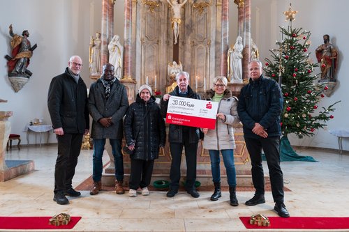 Gabi Strobel (2. v. r.) vom Organisationsteam des Solilaufs übergab den symbolischen Scheck im Rahmen des Gottesdienstes an Walter Klicker (3. v. r.), Vorsitzender des Vereins © Thomas Strobel