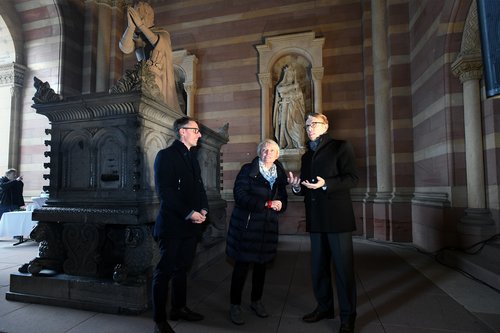 In seiner Ansprache nahm Schappert die Anwesenden mit auf eine Reise durch die wechselvolle Geschichte der Vorhalle. Nach teilweiser Zerstörung im 17. Jahrhundert und barocker Umgestaltung beim Wiederaufbau des 18. Jahrhunderts erhielt die Vorhalle im 19. Jahrhundert schließlich ihre heutige Form. Die dort anwesenden Skulpturen und Grabdenkmäler der Kaiser und Könige seien als „Erinnerungsort“ der deutschen Geschichte geschaffen worden. Diese Erläuterung griff Doris Barnett auf und verwies auf die kulturhistorische Bedeutung der Vorhalle. „Das hier so viele Könige stehen, wo es doch ein Gotteshaus ist", müsse den Besuchern erklärt werden, Mit dieser Erklärung ließe sich hier besonders gut die geschichtliche Bedeutung des Doms begreifen. Als Motivation, den Antrag des Domkapitels zu unterstützen, erklärte Barnett, es gelte, „diese Kulturdenkmal, dieses Glanzstück gut zu und Herzstück der Region erhalten.“ Dr. Lars Castellucci, von der anderen Seite des Rheins kommend, hob die überregionale Bedeutung und Strahlkraft des Doms hervor: „Deshalb ist es richtig und wichtig, dass wir uns von Bundesseite engagieren“, sagte er. Durch die Sanierung erhoffe er sich, „dass der alte Glanz der Vorhalle wieder hergestellt wird, so dass der erste Eindruck zu dem passe, was einem im Dom erwartet.“