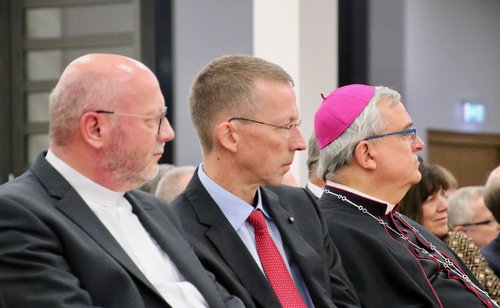 Den Auftakt der Feierlichkeiten bildete ein Pontifikalamt mit Bischof Dr. Karl-Heinz Wiesemann, der selbst auch Mitglied des Ritterordens ist. Er nahm die Schilderung des Streitgesprächs Jesu mit den Sadduzäern im Tagesevangelium (Mt 22,34-40) zum Anlass, auf die Gefahren theologischer Extrempositionen hinzuweisen. So gäbe es zum einen die Gefahr, aus einer aufklärerischen Position heraus die Glaubensüberlieferung so zu hinterfragen, dass am Schluss letztlich kaum noch Platz für den Glauben verbleibe. Zum anderen gäbe es die Gefahr, aus einer allzu traditionell verhafteten Haltung heraus, jede theologische Weiterentwicklung in Frage zu stellen, was dazu führe, dass lebendiges geistliches Leben erdrückt werde.