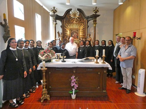 „Das Element, das den Menschen trägt und ihn nicht abstürzen lässt, ist die Liebe“, betonte Weihbischof Georgens in seiner Predigt. Er zog den Vergleich zum Element Wasser, in dem die Fische leben und getragen werden, so wie die Vögel in der Luft in ihrem Element sind. Die verlässliche Liebe Gottes zum Menschen, die vor allem anderen stehe - auch vor der Liebe der Menschen zu Gott - sei die Quelle, aus der die St. Martha-Schwestern die Kraft für ihren Dienst schöpften. Und er unterstrich, wie segensreich dieser Dienst im Bistum sei und dankte den Schwestern von Herzen dafür. „Sie sind ein Segen für die Menschen!“ Für die Zukunft wünschte er, „dass Sie in Ihrem Element bleiben“. Beendet wurde der Gottesdienst mit zwei Liedern in der indischen Heimatsprache der Schwestern. Das erste stimmte der Weihbischof textsicher an, das zweite sangen die Schwester als „Ständchen“ für die Gemeinde.