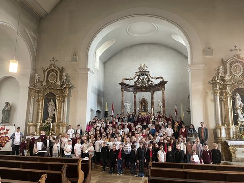 Mutterstadt. Rund 180 junge Sängerinnen und Sänger trafen sich Mitte Mai in Mutterstadt zu ihrem jährlichen Chortag der PUERI CANTORES im Bistum Speyer. Gleich zu Beginn erfüllten die jungen Stimmen die katholische Kirche St. Medardus mit den wunderbaren Klängen des „Benedictus“ des zeitgenössischen Komponisten Karl Jenkins. Anschließend wurde nach Altersgruppen getrennt in den Räumlichkeiten der Pfarrei St. Medardus Mutterstadt geprobt.