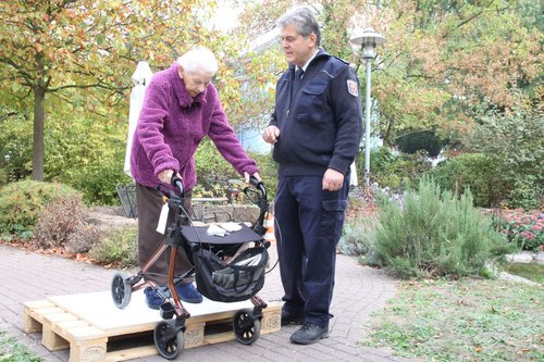 Polizeihauptkommisssar Matthias Michel zeigt Käthe Neu, wie sie mit ihrem Rollator ein Hindernis überwinden kann