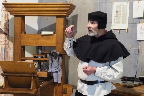 Flankiert wird die „Zeitreise“, die nur mit einer Führung besucht werden kann, von verschiedenen Angeboten im Foyer des katholischen Pfarrheims: Herzstück ist dort eine Ausstellung mit besonderen Bibeln aus Privatbesitz: z.B. eine Bibel von 1617, ein Nachdruck der „längsten Bibel der Welt“ (das Original ist 1,2 km lang) und Bibeln in anderen Sprachen. Im Foyer steht auch eine kleine Druckerpresse, an der man ausprobieren kann, wie in der Anfangszeit des Buchdrucks einzelne Seiten gedruckt wurden. Obwohl wegen der strengeren Hygienevorschriften einige Dinge geändert werden mussten, wird weiterhin die Möglichkeit geboten, nach dem Besuch einer Führung im Bistro mit Gruppenbegleitern oder anderen Aktiven ins Gespräch zu kommen.