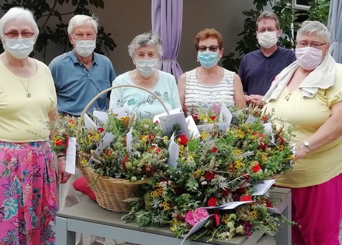 Das setzten die ehrenamtlichen Mitarbeiter*innen wie geplant um. Am Tag vor dem Fest wurden die in den Tagen zuvor von den Ehrenamtlichen gesammelten Kräuter auf zwei langen Tischen im Hof des Altenzentrums ausgebreitet. Unter Mitarbeit von Pfarrer Thomas Brenner banden die Beteiligten unter strenger Beachtung aller Hygienevorschriften mit Mund- und Nasenschutz sowie bei Einhaltung des Mindestabstands rund 70 kleine, duftende Kunstwerke.