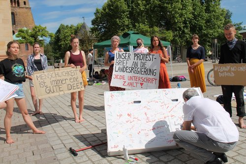 Im Gepäck haben sie auf ihrem Marsch einen großen Briefumschlag, auf dem sie Unterschriften für ihr Anliegen sammeln und den sie in Mainz an die für Integration zuständige Ministerin Anne Spiegel überreichen wollen. In dem darin enthaltenen Brief fordern die Aktivisten die Abgeordneten des Landtages und die Landesregierung unter anderem dazu auf, ein Landesaufnahmeprogramm für Flüchtlinge zu starten und für sichere und legale Zugangswege nach Deutschland zu sorgen. Außerdem setzen sie sich für Quarantäne- und Schutzmaßnahmen gegen das Coronavirus in den Lagern und eine Legalisierung der Seenotrettung ein.