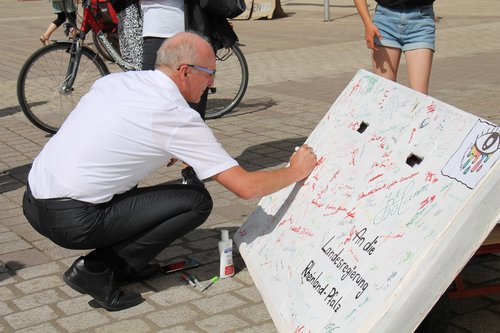 „Wir sind hier, weil wir unsere Forderungen direkt zur Landesregierung bringen wollen“, erklären die beiden Aktivisten Clara und Bjarne. Die Situation in den Flüchtlingslagern sei katastrophal. „Wir wollten nicht länger zusehen.“ Zu Beginn ihrer Protestaktion hatten die Aktivisten aus Landau mit einem Hungerstreik, der mit einer Mahnwache auf dem Rathausplatz der südpfälzischen Stadt verbunden war, auf ihre Forderungen aufmerksam gemacht. „Aber darauf haben wir keine Reaktion von der Politik bekommen, deshalb machen wir jetzt den Protestmarsch“, so die beiden jungen Vertreter der Gruppe „Coloured Rain“.