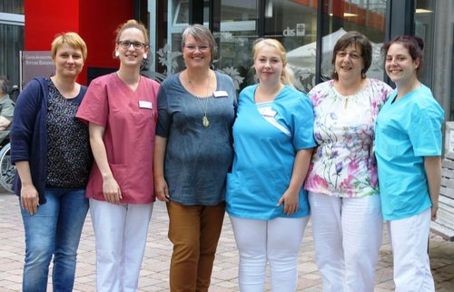 Ausbildung im Seniorenzentrum (v.l.): Cornelia Braun (stellv. Pflegedienstleiterin), Sarah Batu (Schülerin 3. Ausbildungsjahr), Verena Renner (Einrichtungsleiterin) Svenja Becher (Schülerin 1. Jahr), Christine Schenck (Praxisanleiterin) und Sara Michel-Döbler (1. Jahr).