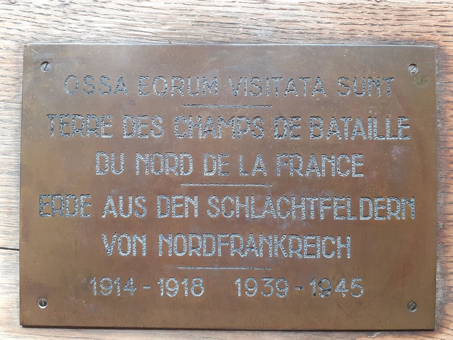 Im Jahr 1956 wurde der Pax Christ Kapelle, die sich in der Krypta unter dem Altarraum von St. Bernhard befindet, eine Eichenholzkiste mit Erde aus nordfranzösischen Schlachtfeldern gewidmet. In sieben Säckchen werden in ihr Schlachtfeld- und Graberden von Orten des 1. und 2. Weltkrieges aufbewahrt, die Erinnern, Gedenken und vor allem Mahnen sollen, dass Krieg immer für unendliches Leid steht. Diese Kiste wurde ihrem Wert und ihrer Bedeutung angemessen in die Pax Christ Kapelle verbracht, dort aber nie beigesetzt, wie es mit den anderen Erden und Gedenkstücken aus verschiedenen Kontinente, die meist von Kriegs- und Schreckensorten stammen, geschehen ist. Sie stand seither unbemerkt in einer Ecke der Sakristei von St. Bernhard. Erst vor kurzem wurde durch Recherchen mehr darüber herausgefunden, darüber wird Dr. Markus Lamm berichten.