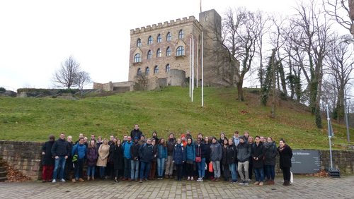 Am Samstag ging es zuerst zur Deutschen Hochschule für Verwaltungswissenschaften (DUV), wo alle von dortigen Studierenden und Prof. Dr. Stefan Fisch willkommen geheißen wurden. Nach einigen einführenden Worten über die Hochschule, welche die einzige post-univärsitäre Universität in Deutschland ist, gab Prof. Fisch einen profunden Einblick in die Entstehung und ideengeschichtliche (Nach)Wirkung des Hambacher Festes von 1832. Dann ging es hinauf zum Hambacher Schloss. Dort angekommen, begeisterte als erstes die grandiose Aussicht über die Rheinebene. Die anstehende Führung erfolgte in zwei Gruppen, wozu auch zwei workshops zur Auswahl standen: ‚Das politisches Lied im 19. Jahrhundert‘ bzw. ‚Die politische Karikatur im Wandel der Zeit‘. Nächste Station war der ‚Weincampus‘ bei Neustadt. Die Begrüßung dort übernahm Prof. Dr. Durner, der nicht nur eine sehr informative Einführung zum Weincampus und dem modernen Weinbau gab, sondern auch Wissenswertes zum Wein bei einer ausführlichen Weinprobe in der Probierstube des angeschlossenen Staatsweingutes bot.