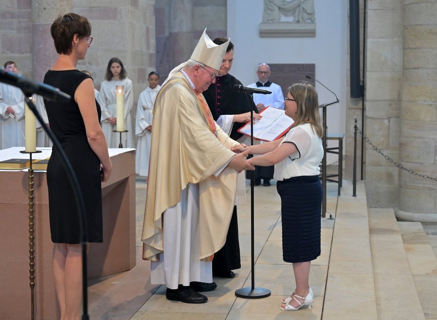 Speyer. In einem feierlichen Gottesdienst wurden die Gemeindereferentinnen Nicole Gajos und Alina Menzel, am Sonntag, im Dom zu Speyer, von Weihbischof Otto Georgens offiziell in den seelsorglichen Dienst des Bistums Speyer ausgesandt. Die beiden Gemeindereferentinnen werden zum 1. August ihre neuen Stellen antreten: Gajos wird künftig in der Pfarrei Dahn Hl. Petrus tätig sein, Menzel in der Pfarrei Wörth Hl. Christophorus. Der „Bestimmungsort, die Destination, das Ziel“, seien laut Georgens nicht nur geographisch zu verstehen. Er appellierte daran, als „Macher“ an einer erfolgreichen Kirche mitzuwirken. Trotz zahlreicher Herausforderungen gelte: „Lasst die Freude nicht zu kurz kommen!“