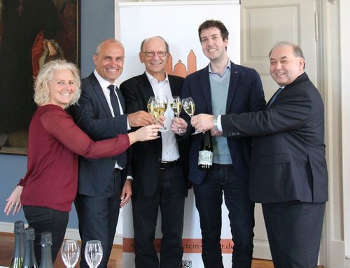 Sie stoßen auf den erfolgreichen Verkauf des Domsektes an (v.l.n.r.) Bettina Steiger (Geschäftsstelle Dombauverein), Mathias Geisert (Vorstand Dombauverein), Dr. Gottfried Jung (Vorstandsvorsitzender Dombauverein), Dr. Bastian Klohr (Geschäftsführender Vorstand der Weinbeit Manufaktur eG), Winfried Szkutnik (Schatzmeister Dombauverein).