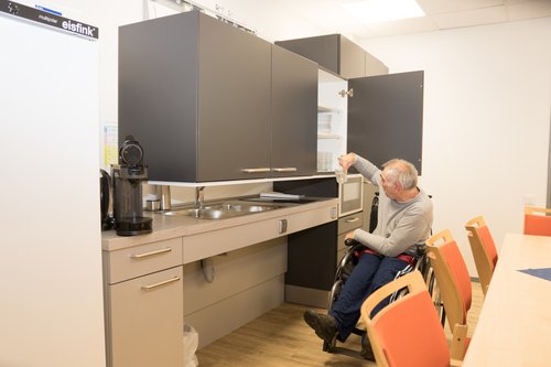 Herde und Spülen sind im Haus St. Elisabeth nicht nur mit dem Rollstuhl unterfahrbar - sie lassen sich zudem einfach per Knopfdruck absenken, ebenso die Oberschränke in den Küchen. Diese Funktion übertrifft ebenfalls die Anforderungen bei Weitem. Die Bewohner nutzen die höhenverstellbare Kücheneinrichtung oft und gern. Diese Ausstattung „dient dem Zweck, dass die Bewohner so selbstständig wie möglich sind“, erläutert Winfried Hoffmann. Die hohe Eigenständigkeit der Frauen und Männer sei ein zentraler Punkt, bekräftigt er.