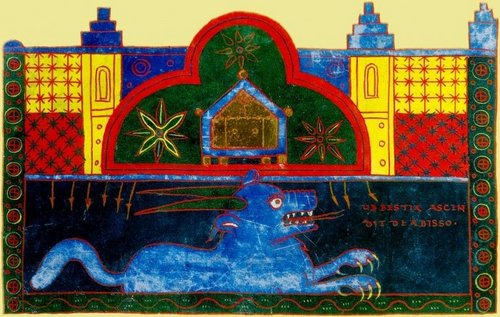 Das Ausstellungsplakat demonstriert: einen himmelblau „getarnten“ Aggressor im Untergrund, die „Bestie“ „aus dem Abgrund“, keine Unbekannte, damit beschäftigt, alles erfindliche Verderben für den Menschen zu organisieren. Sie liegt unter dem „Tempel“, der ein Bild des Himmel Gottes ist - und will dessen Zusammenbruch: ein Beispiel abstrakter Kunst des Mittelalters.