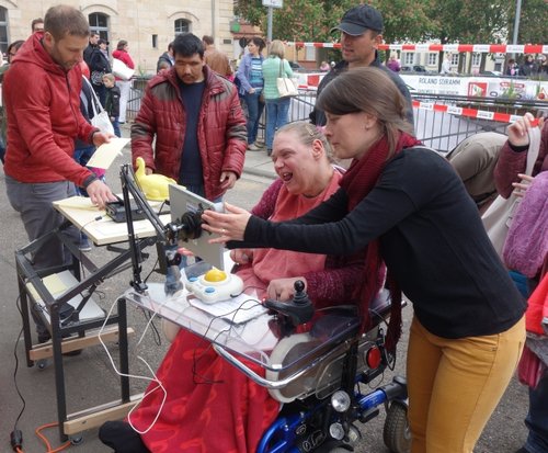 „Wichtig war für uns, dass sich bei unserer Idee die Menschen aus unserer Tagesförderstätten-Gruppe Waffenstraße mit in die Aktion einbringen konnten“, so Zimmermann. So war die Idee eines Fotostandes schnell geboren. An diesem Stand konnten sich alle Besucher kostenlos mit einer lebensgroßen Ente, dargestellt von Praktikant Felix Rinnert, fotografieren lassen. Zudem hatten alle im Vorfeld Entenaccessoires gesammelt, so dass man sich auch verkleiden konnte. Ines Querido, Birgit Seibert und Mohammad Rezai managten den Stand gemeinsam und hatten auch im Vorfeld für die tolle Unterwasserlandschaft gesorgt. Die Fotos konnten alle nach einer kurzen Wartezeit - die von Thomas Estelmann mit dem Ausschenken von Mangosaft verkürzt wurde - gleich mitnehmen.