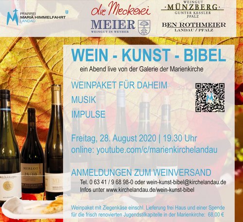 Wer teilnehmen will kann sich im Pfarramt Mariä Himmelfahrt (Tel. 06341 / 96 89 80) oder per Mail wein-kunst-bibel@kirchelandau.de bis zum 18. August anmelden. Dann treffen nach der Bestellung ein Sixpack ausgewählter Weine, Ziegenkäse und kleine Rezepte zum Nachbacken und Naschen zuhause ein. Im Paketpreis ist auch eine Spende für die frisch restaurierten Jugendstilkapitelle der Marienkirche enthalten.