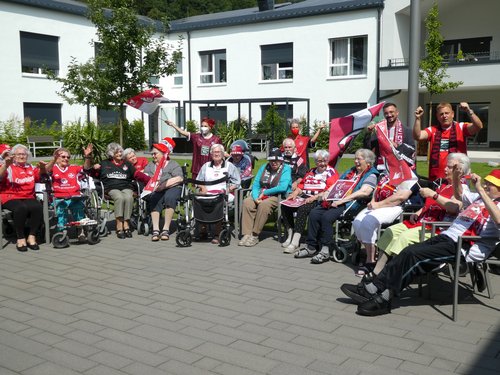 Die Bewohnerinnen und Bewohner des Caritas-Altenzentrums St. Nikolaus haben einen FCK-Fanclub gegründet. Auch der Leiter des Hauses, Thomas Matz (stehend ganz rechts) ist ein großer Fan.